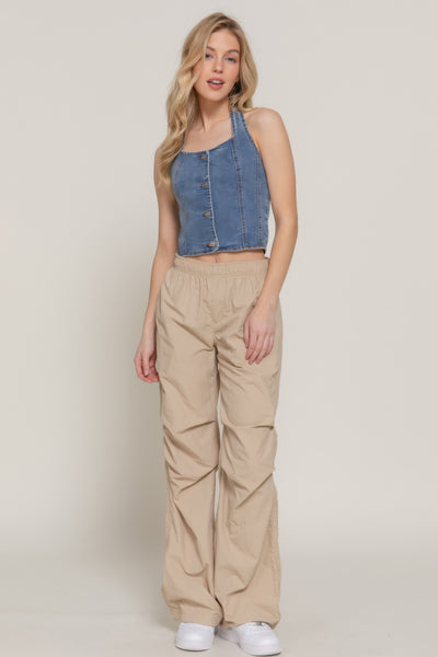 Bring a fresh twist to classic denim with this button-down stretch denim halter top. Featuring a flattering halter neckline and exposed button-front closure, this top hugs your shape with its structured seams and soft-stretch fabric. The cropped length makes it perfect for pairing with high-rise jeans, shorts, or skirts, while the faded wash and contrast stitching add authentic denim charm. Equal parts edgy and flattering, it’s a versatile staple that brings effortless style to any casual look.
