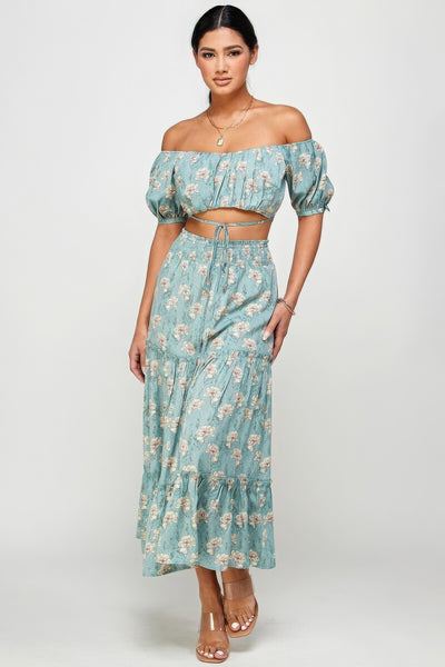 Floral Off Shoulder Sleeve Back Tie Top Skirt Set