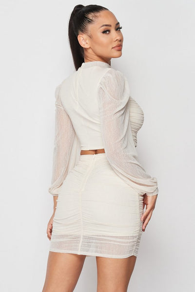 Imported S.M.L SEXY SHEER CUTOUT PUFF SLEEVED TOP AND SKIRT SET 95% Polyester 5% Spandex Cream PRI