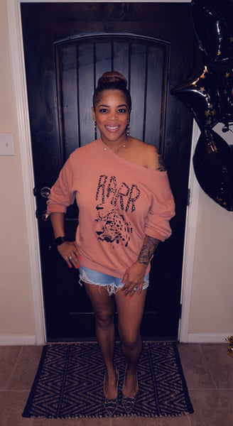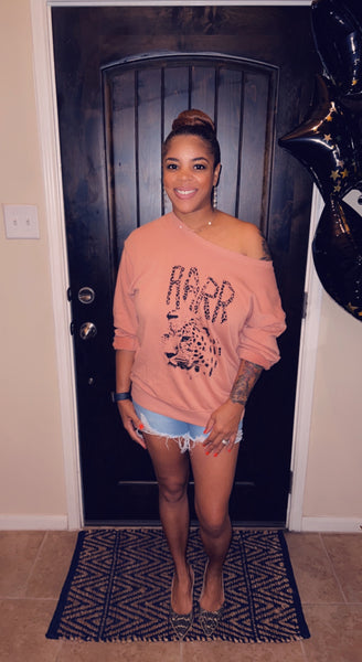 A garment dyed French terry graphic sweatshirt with the following features: Vintage-style leopard graphic with RARR text.Round neckline.