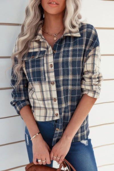 • Plaid Block Lapel Collar Loose Button Down Shirt for added style and flair