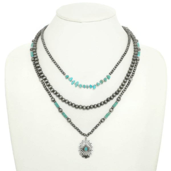 This Western floral pendant necklace and earring set offers a bold blend of rustic charm and boho elegance. Featuring multistrand turquoise beading and a floral pendant centerpiece, it captures the spirit of the Southwest with a handcrafted look. The coordinated earrings complete the look with effortless style. Ideal for dressing up denim, adding edge to dresses, or accessorizing for special events, this set makes a confident statement. A must-have for lovers of country elegance and frontier flair.