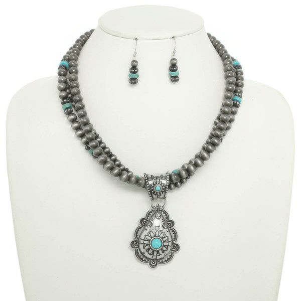This necklace and earring set captures the spirit of the Southwest with a floral turquoise teardrop pendant and layered beading. Designed with earthy tones and vintage-inspired elements, it adds handcrafted charm to any ensemble. The oxidized silver-tone finish enhances its rustic elegance, while the matching earrings provide a refined finishing touch. Ideal for outdoor events, music festivals, or adding character to casual outfits, this set balances bold style with bohemian ease.
