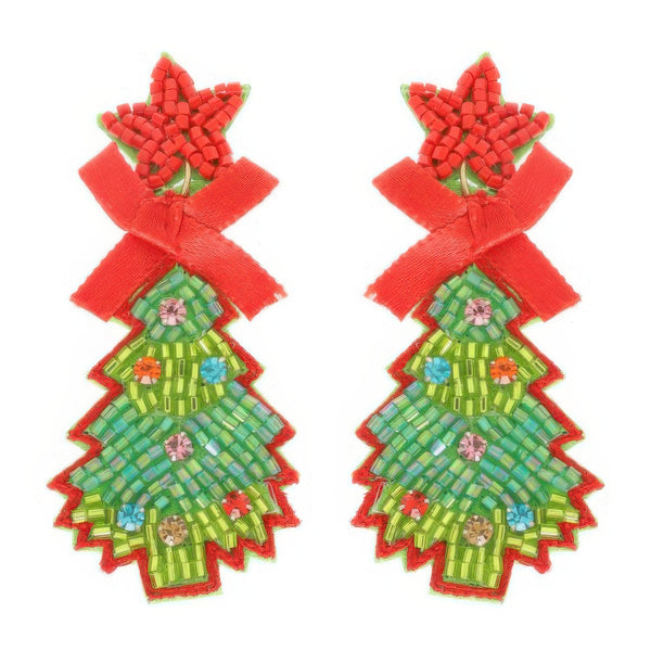 Get into the holiday spirit with these charming Christmas Tree Post Dangle Earrings. Decorated with multi-colored crystals, a red bow, and a sparkling star topper, each detail is designed to shimmer with festive joy. The seed beaded finish adds texture and brilliance, making these earrings perfect for gift giving, cookie swaps, or seasonal celebrations. Light enough for all-day wear, bold enough to be noticed, they’re a cheerful addition to your holiday jewelry box.