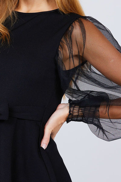 LONG MESH PUFF SLEEVE ROUND NECK W/SELF TIE PEPLUM KNIT TOP