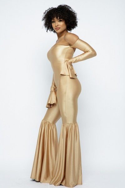 YOGA OFF THE SHOULDER SLIT BELL WIDE LEG FLARE JUMPSUIT