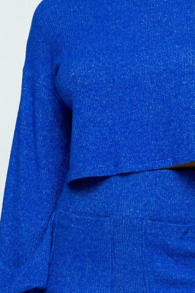 Brushed knit mock neck drop shoulder top with front pocket mini skirt set