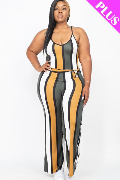 Imported 1XL.2XL.3XL Plus Size Stripe Cami Jumpsuit - A stretch knit wide leg cami Jumpsuit featuring an allover stripe pattern, cami straps, waist belt 92% Polyester 8% Spandex Camel CLA