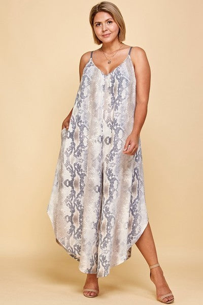 Plus Size Snakeskin Terry Printed Wide Leg Jumpsuit with Deep V Neckline and Adjustable Bra Straps with Pockets