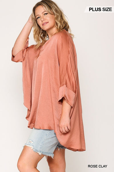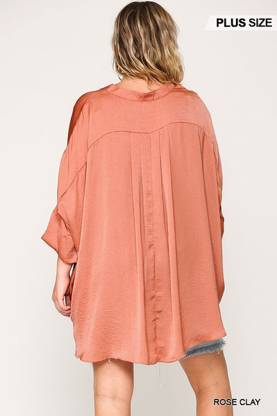 Imported XL.1XL.2XL Washed Satin Button Down Loose Fit Top with Hi-Lo Hem 100% Polyester Rose Clay GIG