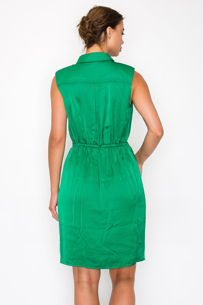 Imported S.M.L A chic woven sleeveless shirt dress featuring a collar, button-down, pleated detail, cinched waist, solid color, elastic back, chest pocket, and a knee length 100% Polyester Fuchsia IRI