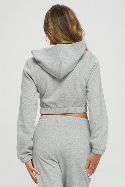 A solid fashion top featuring long sleeves, a corset-inspired waist design, a hoodie, and a cropped hem.