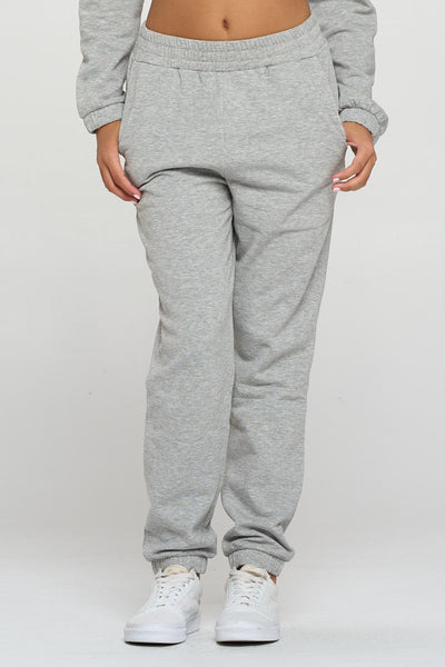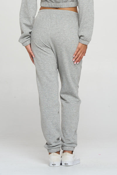 A solid pair of jogger pants featuring an elastic material, a high waist, side pockets, and a full length.