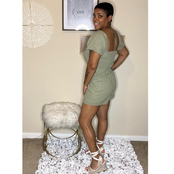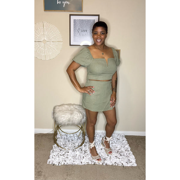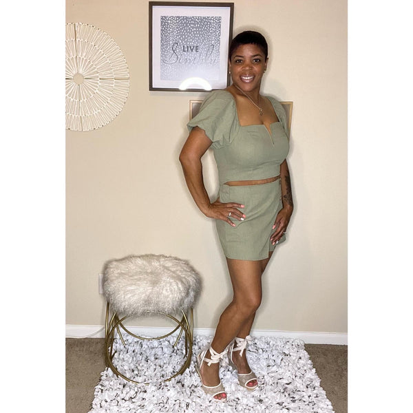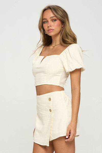 A solid crop top featuring short puff sleeves, square neckline with V-bar, and back shirring details.