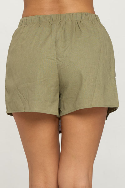 An elastic skort in a solid color featuring asymmetrical hem with side buttons, high waisted, and a mini length.