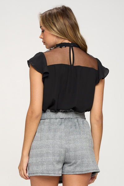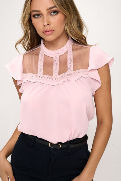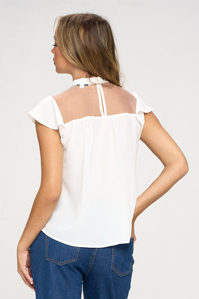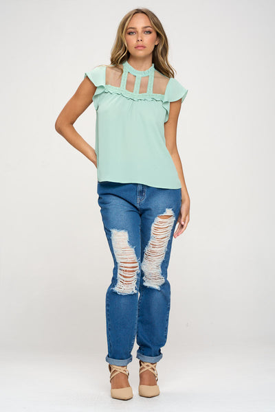 A woven top featuring a lace yoke, mock neckline, back keyhole with button closure, ruffled trim, short flutter sleeves, and a waist-length.