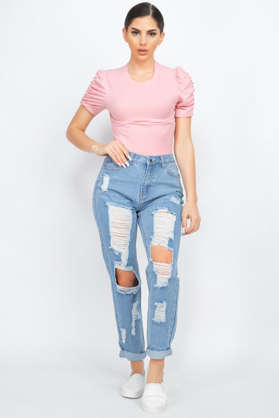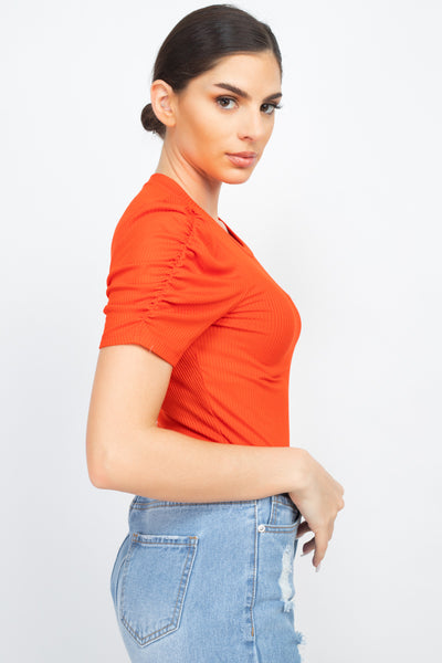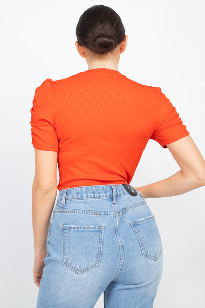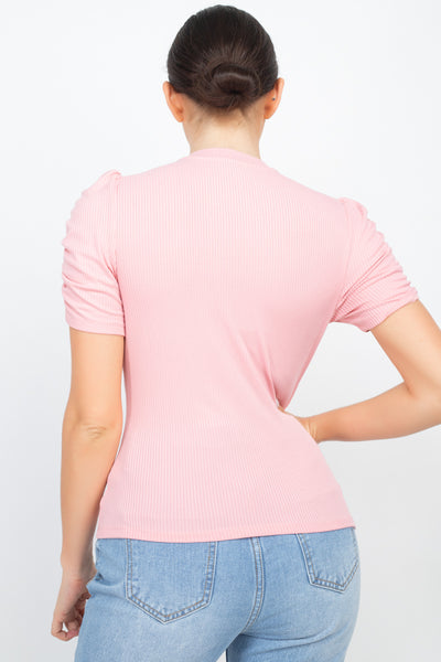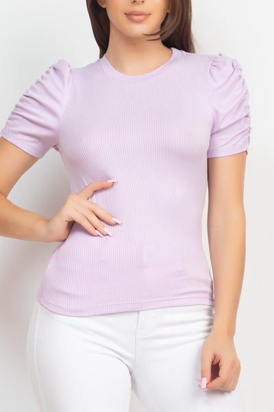 A ribbed knit fashion top in a solid color featuring a round neckline, short ruching sleeves, and a fitted silhouette.