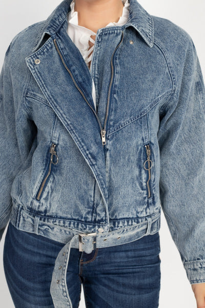 S.M.LA woven jacket featuring a denim wash, zip front closure, side zip pockets, a belted waist, collar, long sleeves, and a ribbed hem.