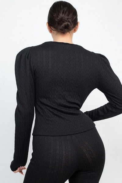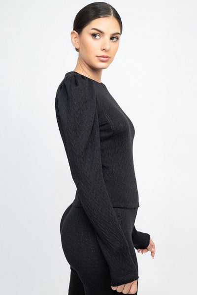 A ribbed knit set featuring a puff sleeve top , long sleeve ,round neckline, as well as a pair of skinny pants and a high-rise banded waist.