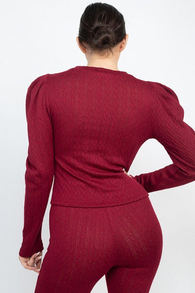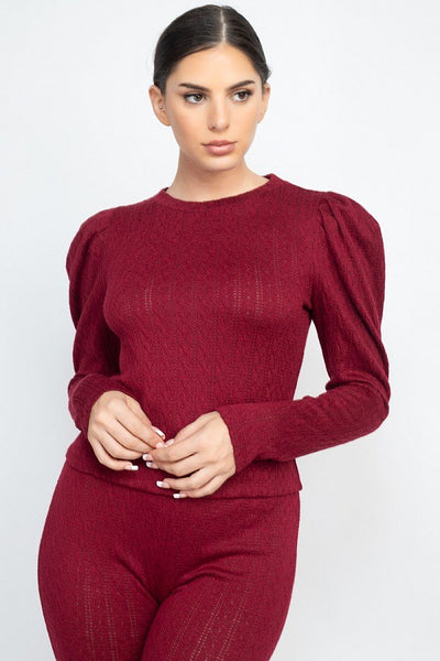 A ribbed knit set featuring a puff sleeve top , long sleeve ,round neckline, as well as a pair of skinny pants and a high-rise banded waist.