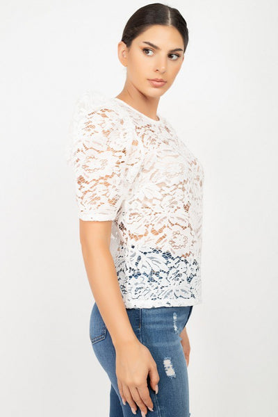 Imported S.M.L A knit top featuring a round neckline, floral lace pattern , short puff sleeves, and back keyhole 55% Cotton 45% Nylon White IRI