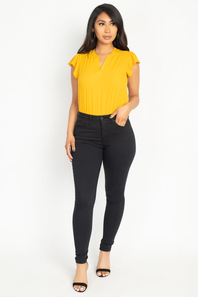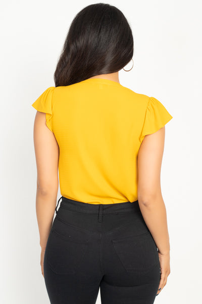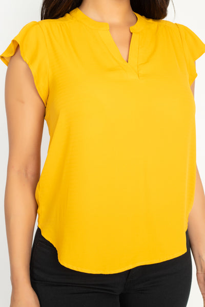 Imported S.M.L A woven top, solid color, a split v-band collar neckline, short ruffle sleeves, and a high low hem. 100% Polyester Light Mustard IRI