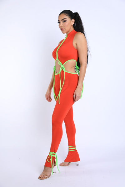 Imported S.M.L String Tie Jumpsuit 92% Polyester 8% Spandex Red KGL