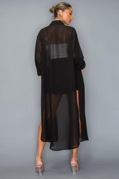 Chiffon Button Down Long Sleeve Side Slit Long Top With Short Set
