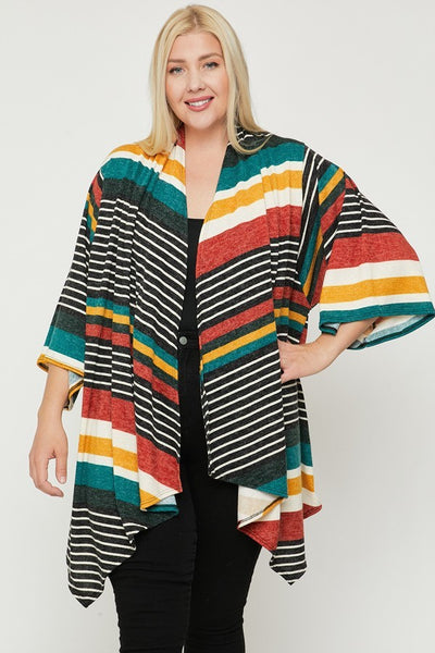 Made In U.S.A 1XL.2XL.3XL Striped cardigan featuring kimono style sleeves and an asymmetrical hem. 33% Rayon 63% Polyester 4% Spandex Mustard POL