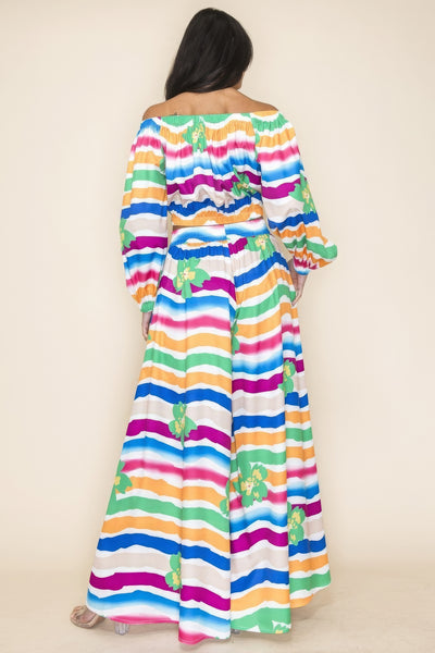 Enhance your wardrobe with our Off-Shoulder Top and Wide Pants Set in Multi. Perfect for embracing sunny days with style and comfort!