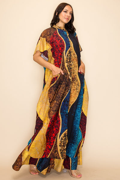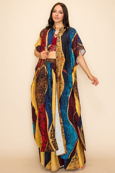 PRINTED WIDE PANTS SET. 2 PIECE. BUTTON DOWN LONG SHIRT WITH POCKETS. WIDE PANTS WITH ELASTIC WAIST