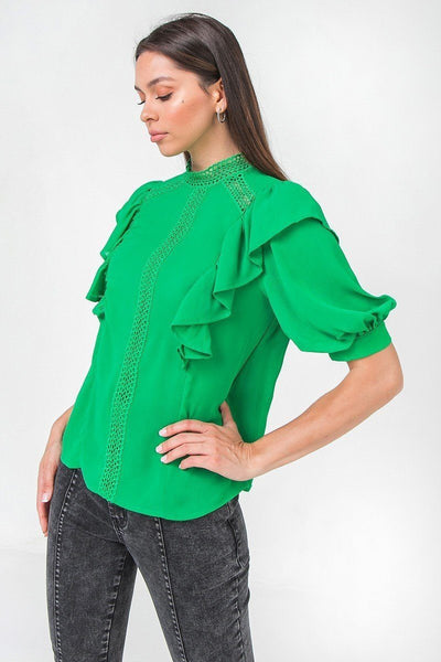 A woven top featuring lace trim neckline, ruffle over shoulder to front, short puff sleeves with back keyhole and button closure
