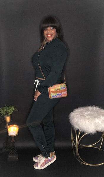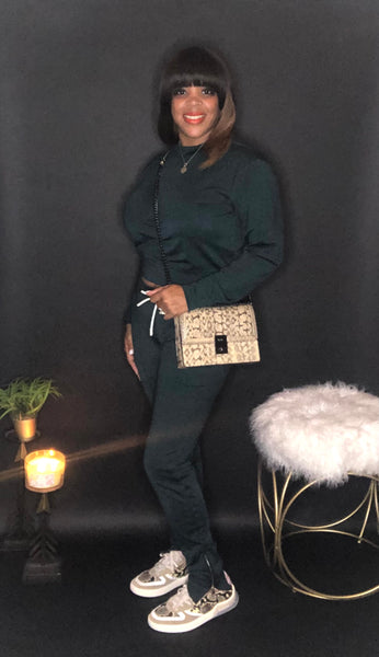 A two piece top and bottom. The sweatshirt features long sleeves with cuff detail. Pants features a band waist, drawstring , two-side pockets and out ankle zippers.