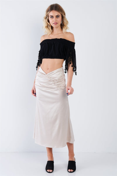 satin, ruffle waist, hidden side zipper, slight v-cut, summer, skirt, midi length, solid, chic, vintage, retro, boho, unlined, some stretch..