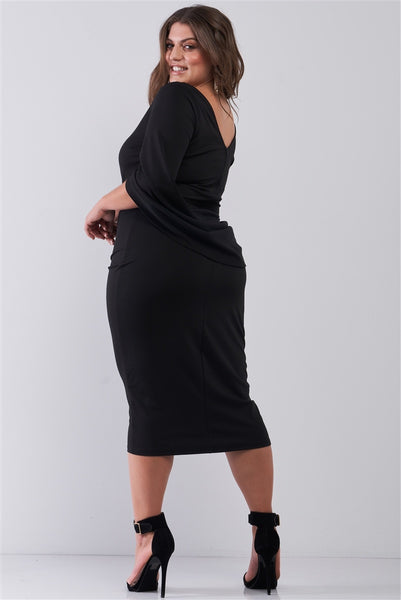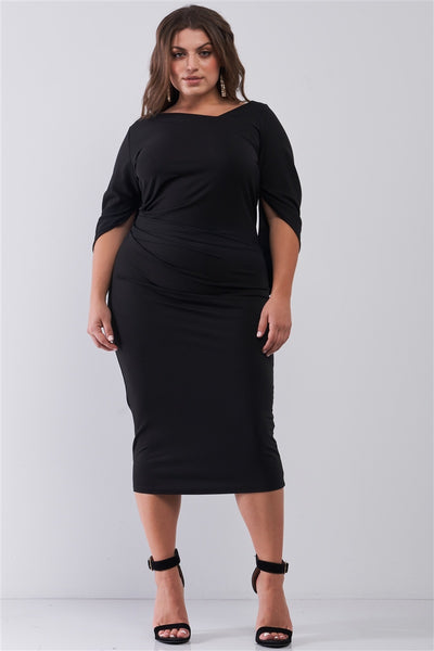 Plus Size Black Asymmetrical Neck Draped Sleeve & Back Detail Fitted Midi Dress