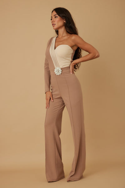 This jumpsuit stands out with its unique design and elegant detailing. The snowflake crystal stones add a touch of glam, making it perfect for those who want to shine at their next event. The Mocha/Beige color palette is versatile and chic, suitable for various occasions.