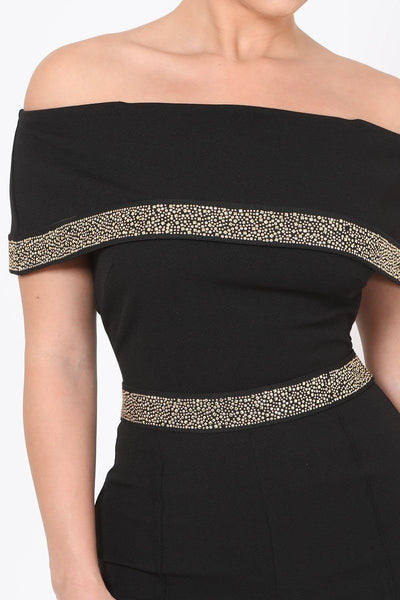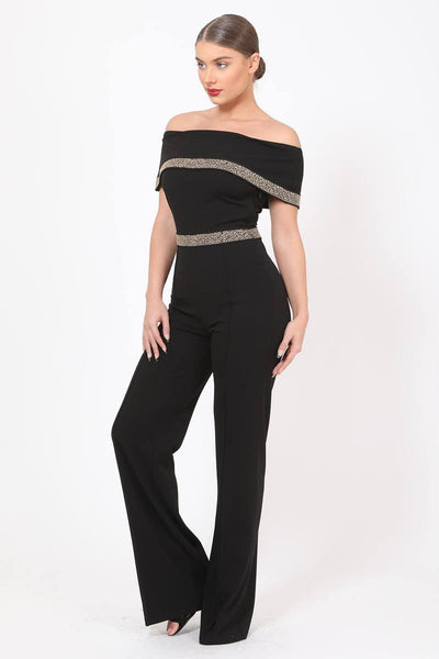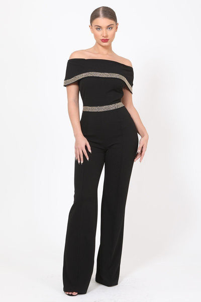 Off Shoulder Jumpsuit. Three Simple Pattern Line, Zipper on Side Front-line Flared Leg Design
