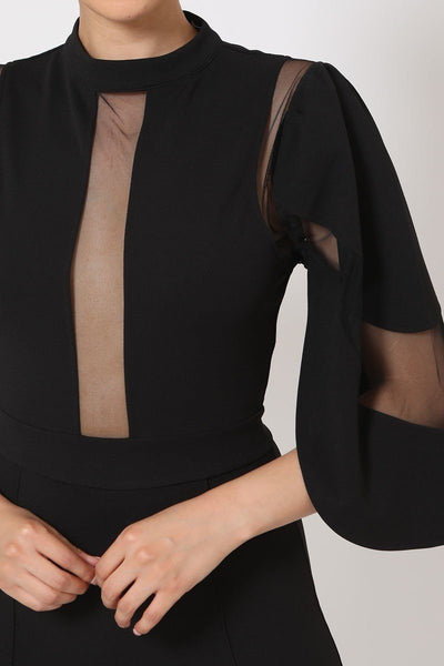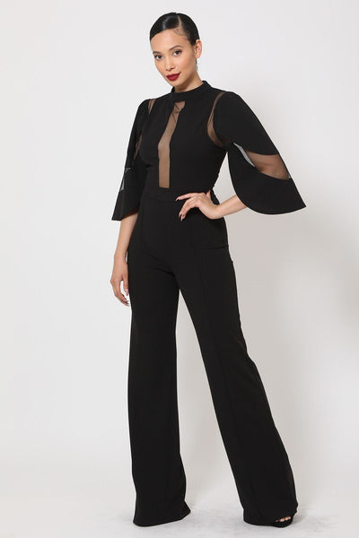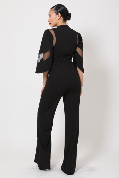 Semi Sheer Mesh Contrast Bodice Jumpsuit Mock Neck, Half Sleeve Frontline Flared Leg Design Zipper on the Back