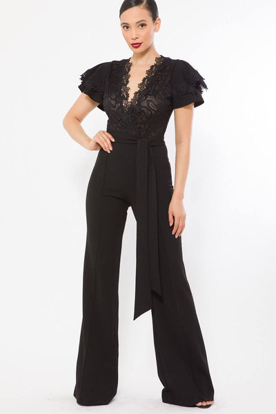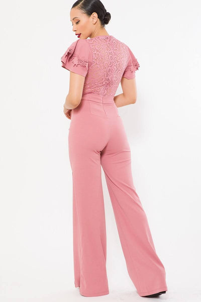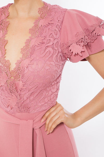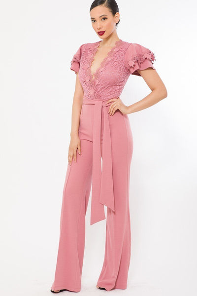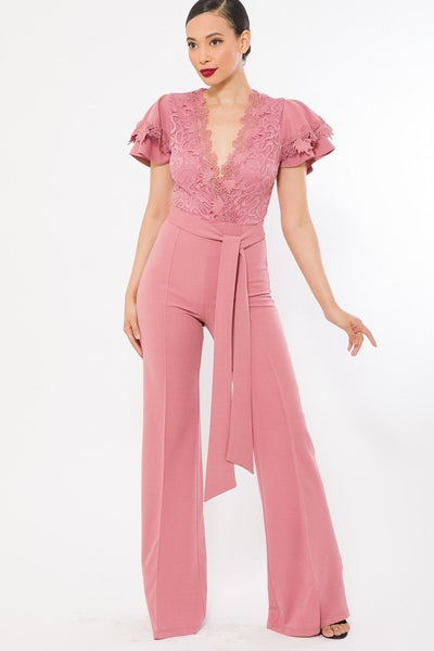 Imported S.M.L Deep V Crochet Lace Jumpsuit. Belt Loops with Self fabric belt on Waist.Cap Sleeves, Zipper on Back 95% Polyester 5% Spandex Mauve VAL