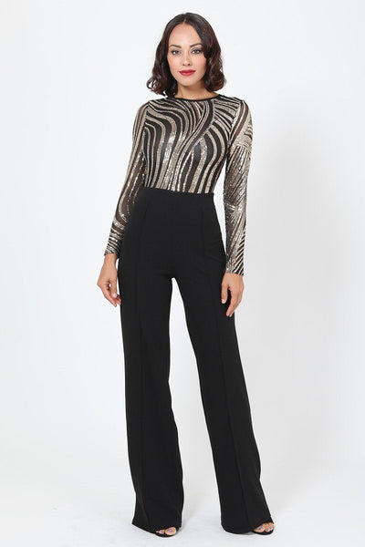 Imported S.M.L Sophisticated Gold Sequins Bodice Jumpsuit Round Neck, Long Sleeves Front-line Flared Leg Design 100% Polyester Black/Gold VAL